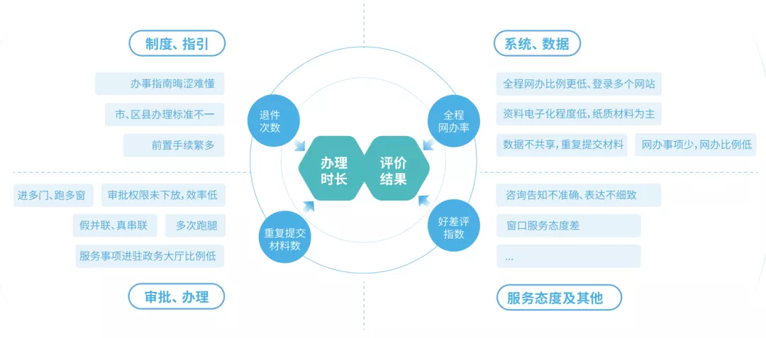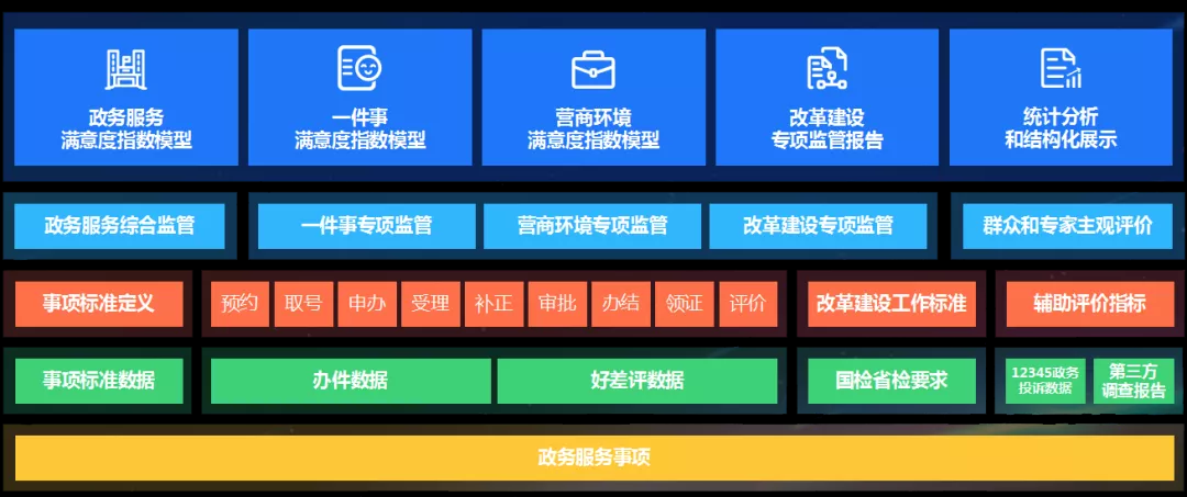 以國檢省檢要求、實現(xiàn)群眾企業(yè)“六個一”辦事需求以及政府各類便民利企政策實施效果為依據(jù)設(shè)立指標(biāo)體系,分為支撐能力、服務(wù)能力、服務(wù)效能、事項管理四個維度,以評估改革建設(shè)工作成效,識別與政策推行要求不符的問題,并定位到具體縣市區(qū)或者責(zé)任單位,再發(fā)布報告以進行督辦改進。