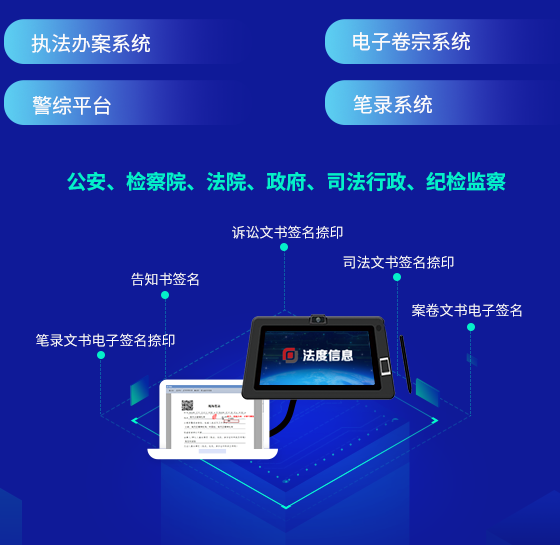 應(yīng)用場景:筆錄文書電子簽名捺印、告知書簽名、訴訟文書簽名捺印、司法文書簽名捺印、案卷文書電子簽名等。
