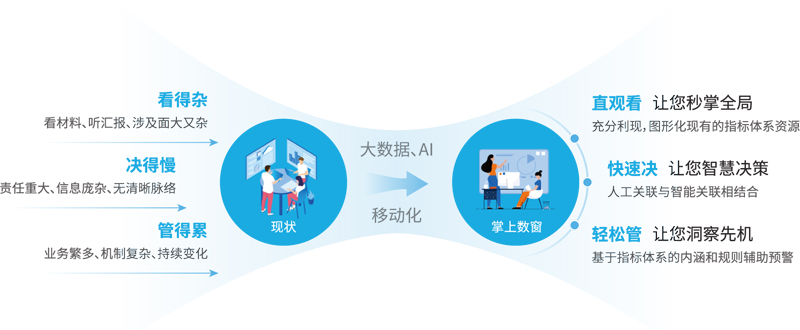 通過提供豐富多樣接入方式的數(shù)據(jù)采集能力、基于指標(biāo)體系快速構(gòu)建的數(shù)據(jù)可視化能力、在線批示一鍵閉環(huán)的業(yè)務(wù)協(xié)作能力、及時精準(zhǔn)有效的決策輔助能力以及多維度精細(xì)化的權(quán)限管控能力,構(gòu)建從采、看、批、決、控 的全鏈路看數(shù)業(yè)務(wù)解決方案,解決業(yè)務(wù)決策者看得雜、管得累、決得慢等痛點問題。