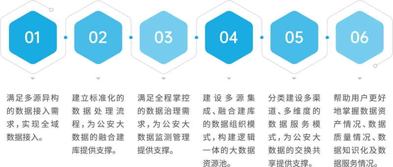 大數據治理工程以“六個統(tǒng)一”為目標,落地“四化”原則,遵循《公安大數據處理技術要求》,具備數據接入 數據處理、數據治理、數據組織、數據服務五大能力,通過對數據資源的智能處理和規(guī)范組織,形成數據增值和數據抽象能力;通過建立集數據標識、數據分析、數據挖掘為一體的計算引擎,形成跨部門、跨系統(tǒng)、跨業(yè)務的智能 數據服務能力;通過對數據全生命周期的精細化治理,形成“總關聯、總索引、總導航”的數據資產化管理能力。